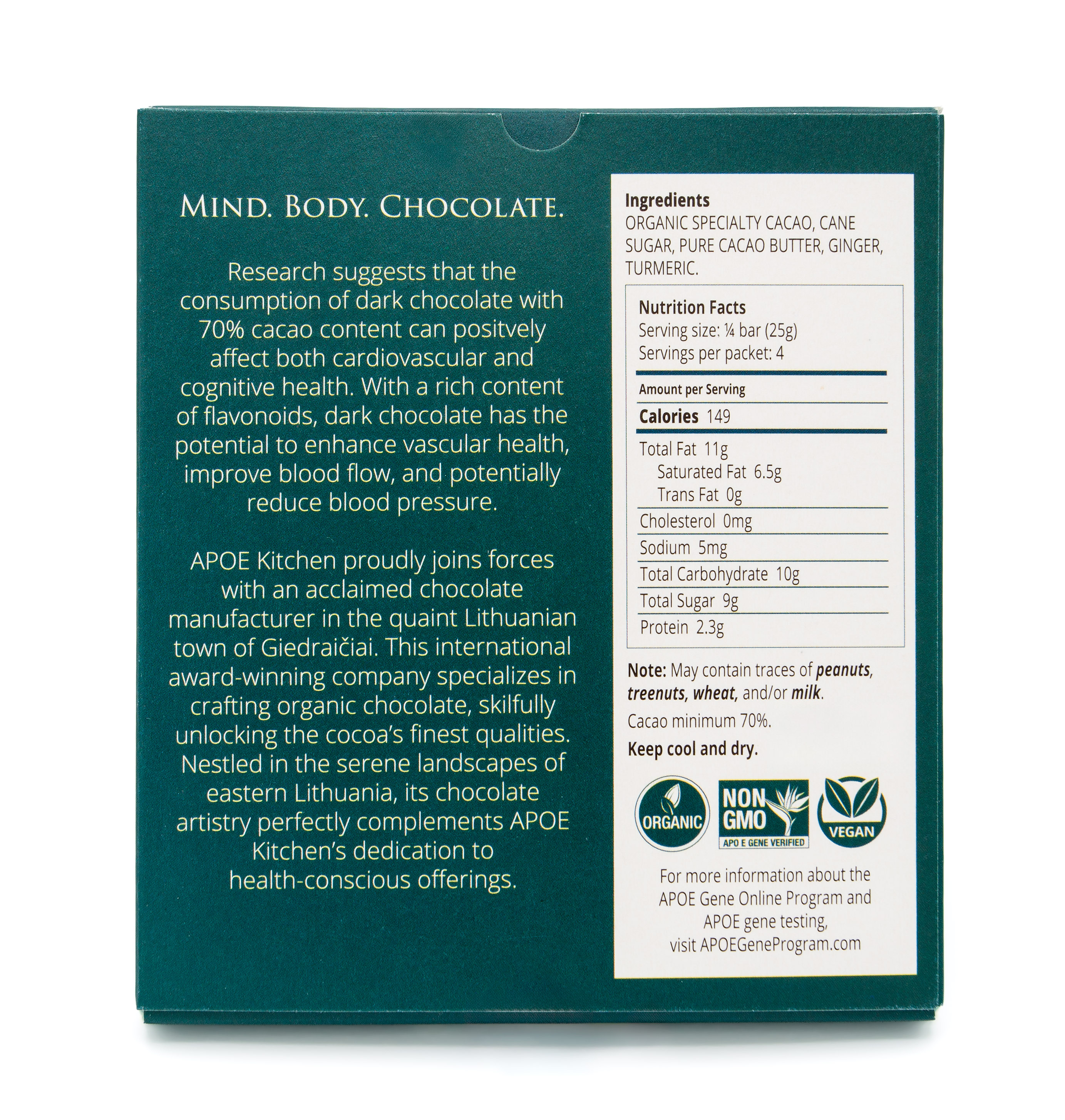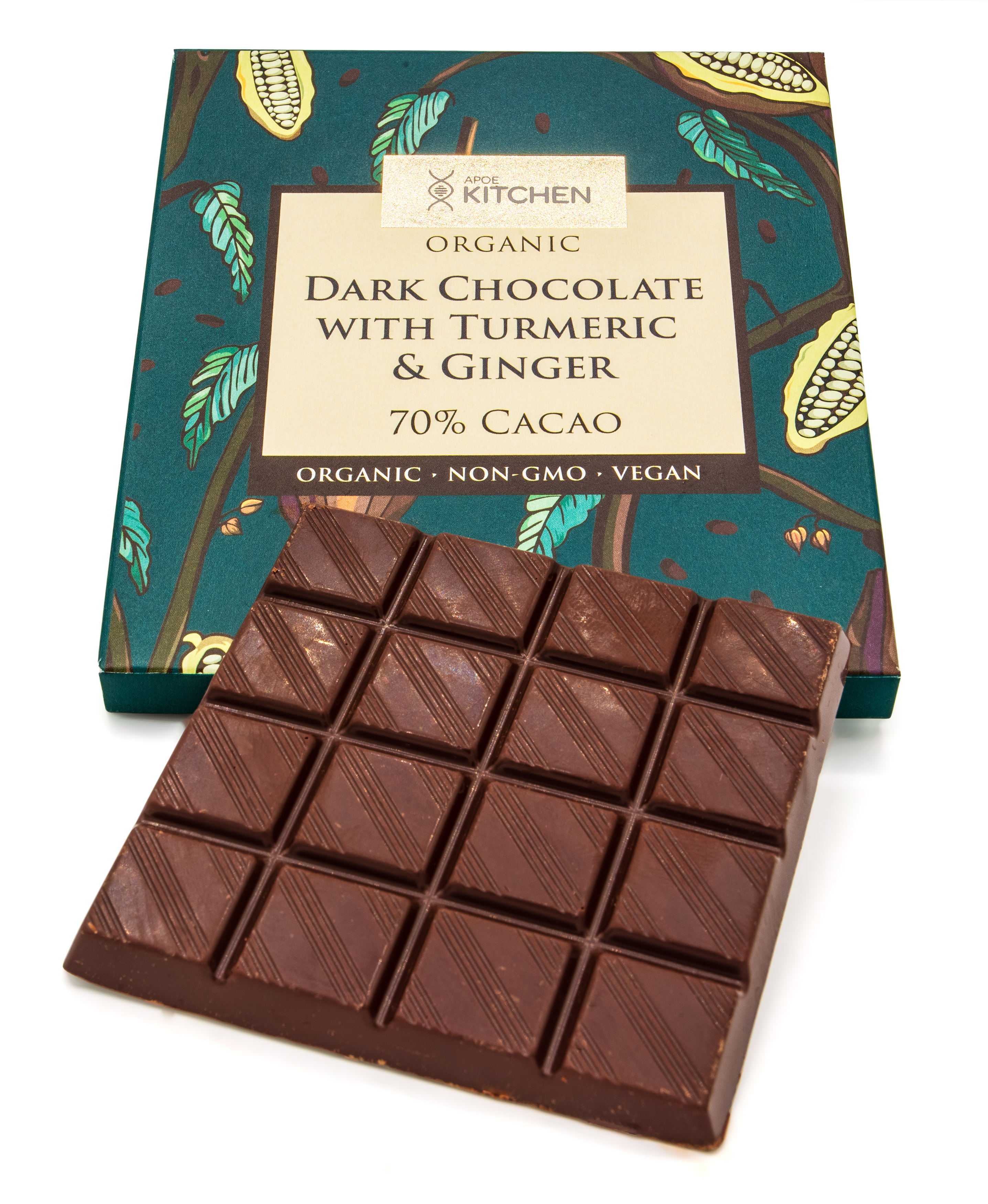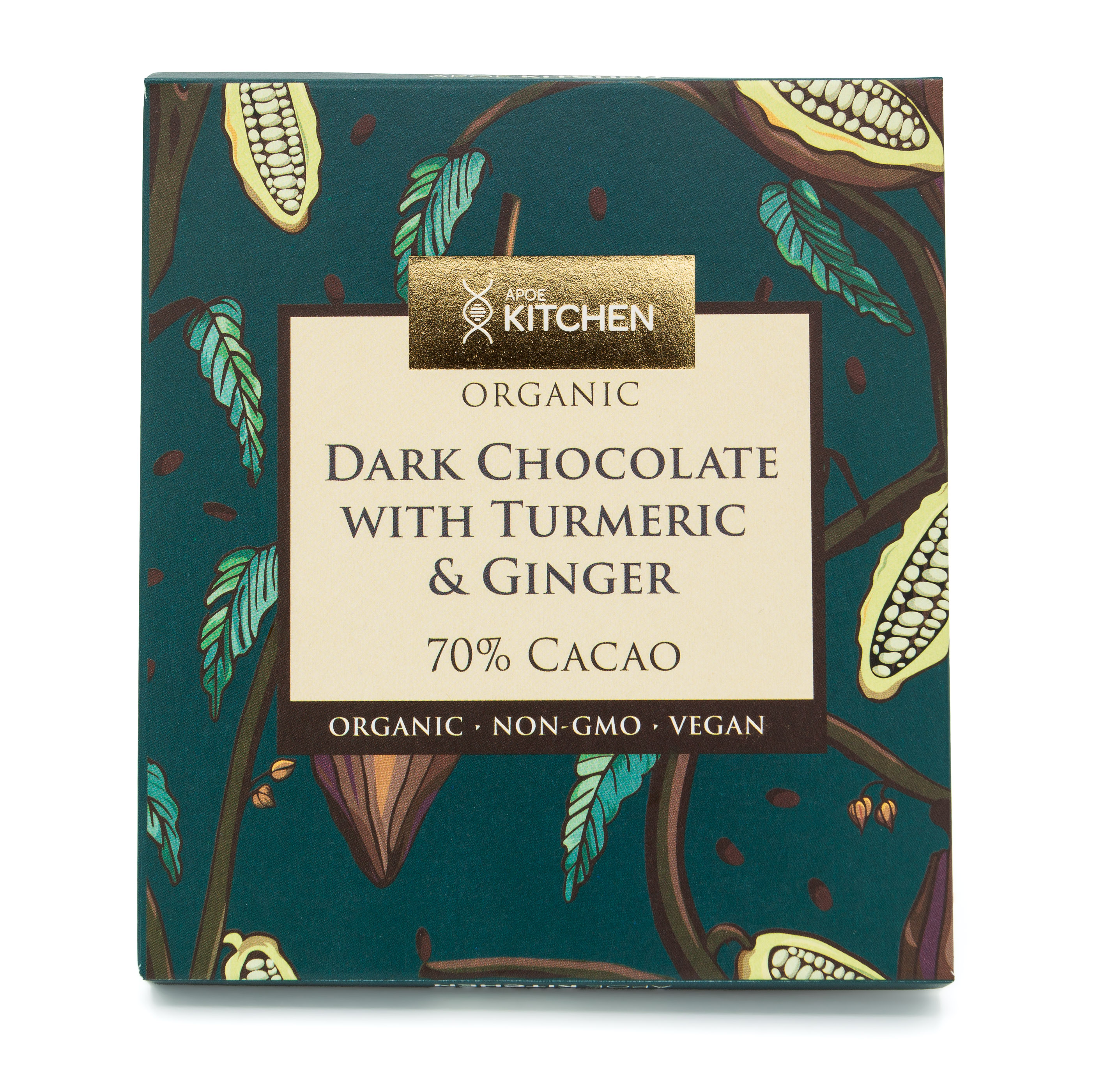 Organic, vegan dark chocolate with anti-inflammatory turmeric and ginger. 70% cacao. No artificial sweeteners.